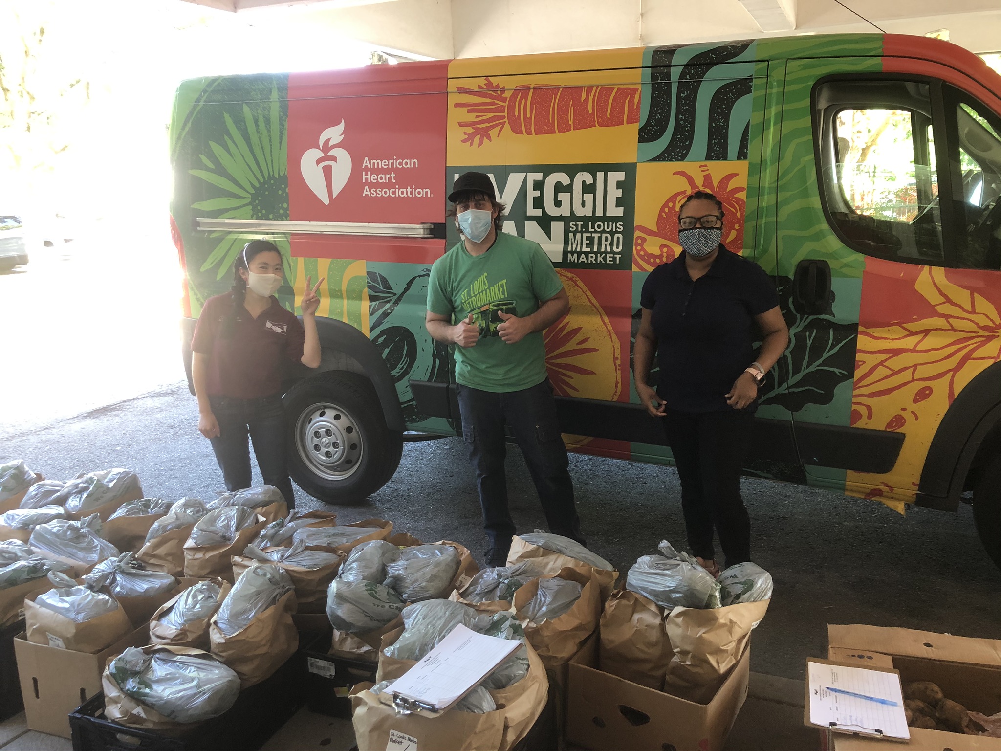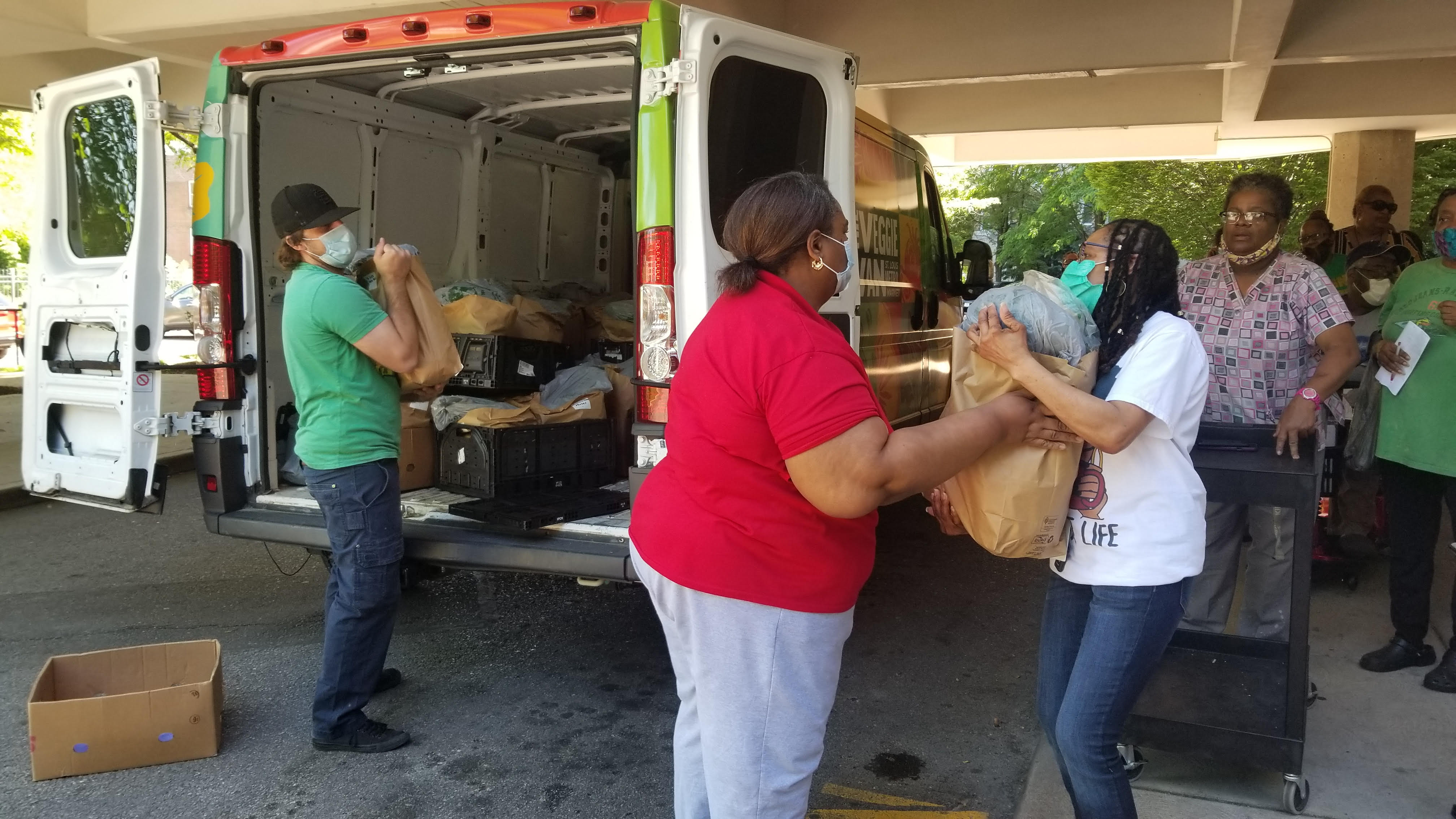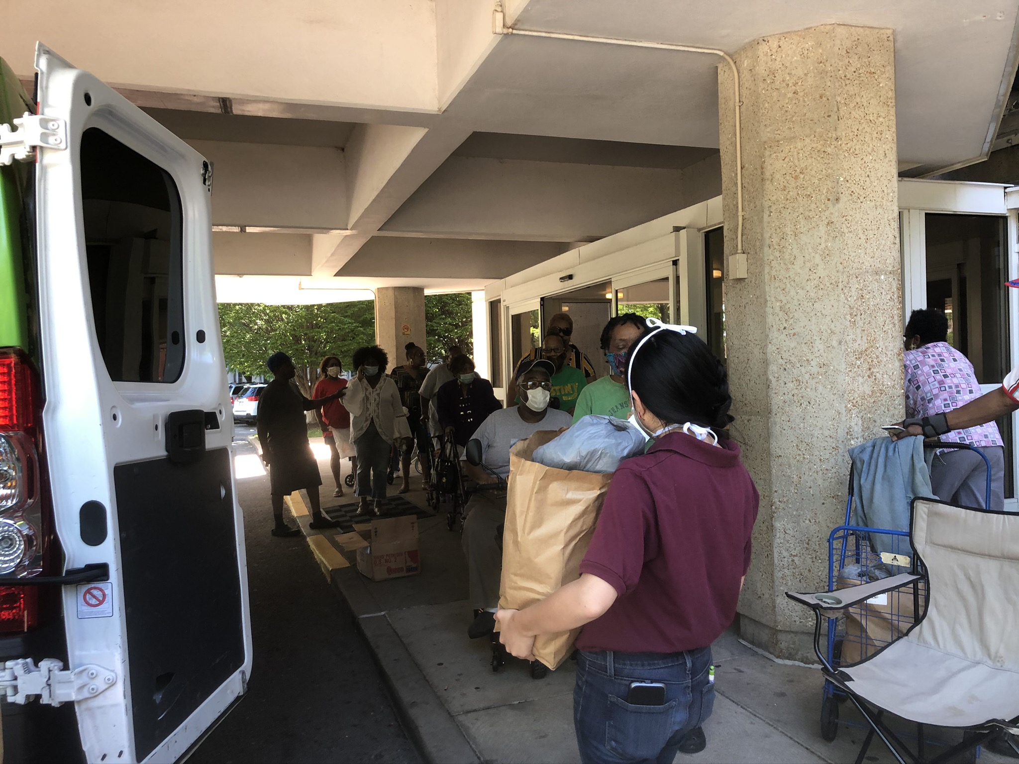 When we pulled up with a van full of fresh produce to just a small line of folks in front of the Homer G. Phillips Senior Apartments, we thought we’d have a long afternoon ahead of us trying to give away all the bags we had brought. However, soon after we started handing out bags of the beautiful produce packed for us by Metro Market St. Louis, these concerns quickly vanished as residents not only called their friends and neighbors to come downstairs to grab their own bags but some residents began to bring bags up to friends and neighbors who could not otherwise pick up a bag.