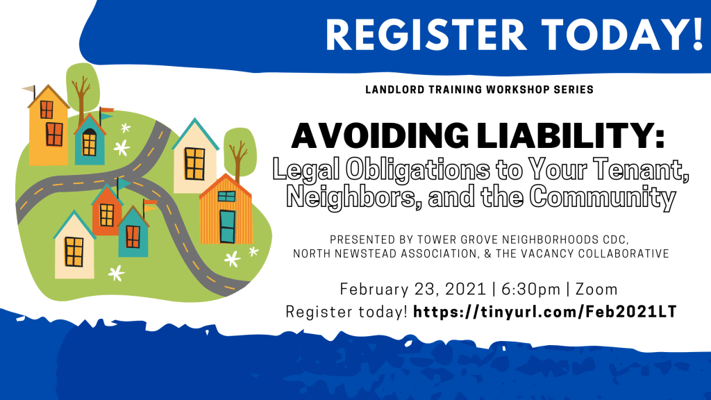The 2021 Landlord & Rehabber Training is a Northside-Southside Collaboration between North Newstead Association, The Vacancy Collaborative, and Tower Grove Neighborhoods CDC. This FREE training is open to all landlords, property managers, rehabbers, developers, and interested parties. Zoom is ADA compliant with exceptions. If you need special accommodations, please contact dana@towergrovecdc.org