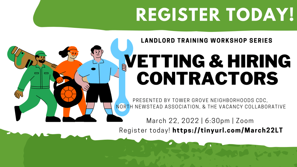 The 2022 Landlord & Rehabber Training is a Northside-Southside Collaboration between North Newstead Association, The Vacancy Collaborative, and Tower Grove Neighborhoods CDC. This FREE training is open to all landlords, property managers, rehabbers, developers, and interested parties. Zoom is ADA compliant with exceptions. If you need special accommodations, please contact dana@towergrovecdc.org