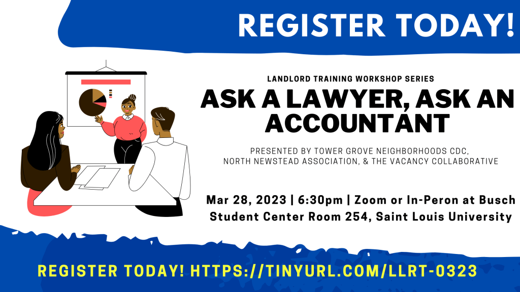 You are invited to a Tues., March 28, 6:30-8:30pm, Landlord & Rehabber Training, Ask an Attorney – Ask an Accountant, offered in-person at the Saint Louis University Busch Student Center, Room #254, or in a Zoom meeting. Register in advance here. (https://forms.gle/ij9kR22pwX7DmJVP8) You must be registered in advance to attend virtually and registration is encouraged for in-person gatherings. Consider arriving early to network, at one of several food & drink options at the Busch Student Center.