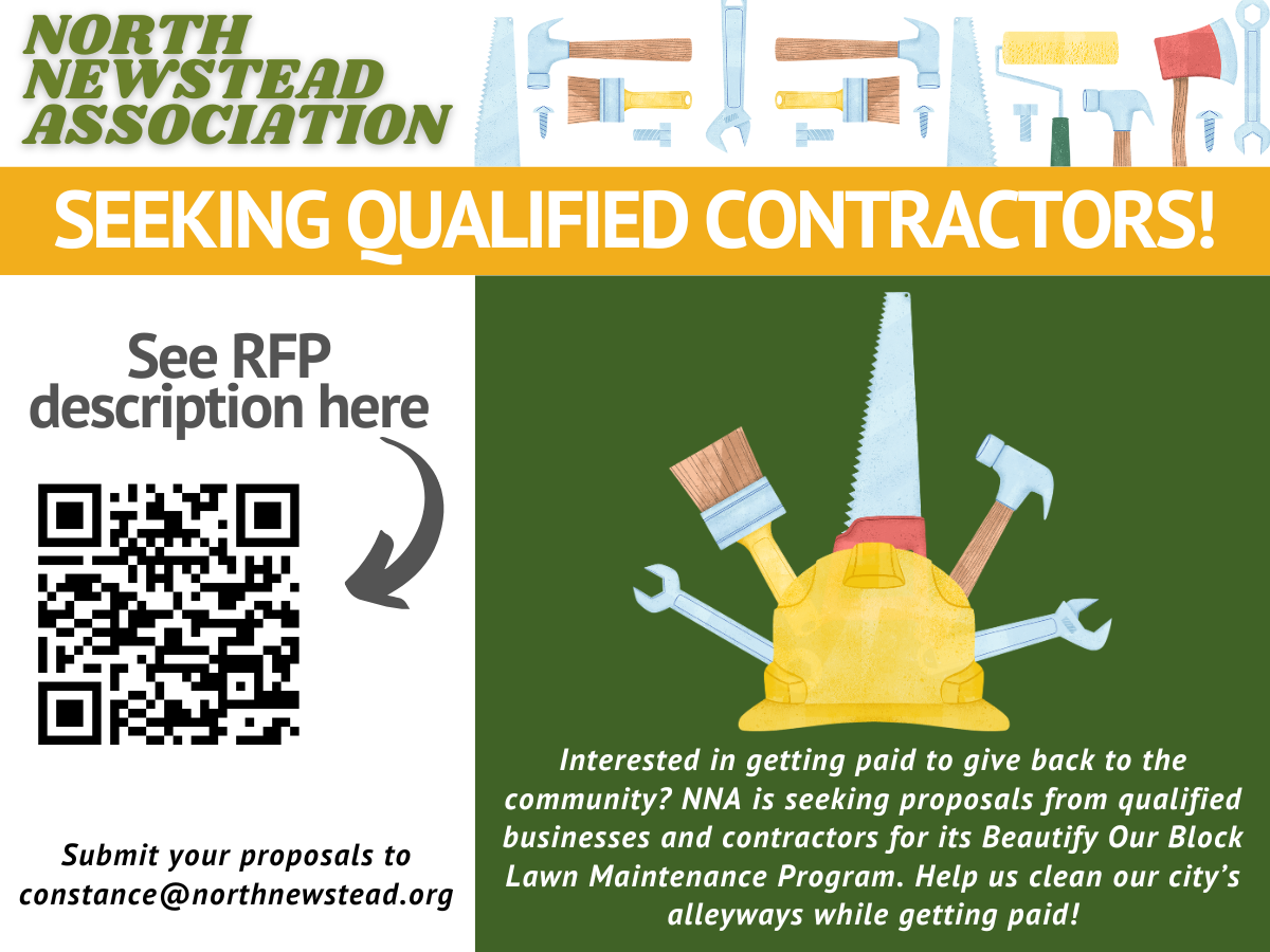 The North Newstead Association (NNA) is seeking proposals for residential lawn maintenance services to support its Beautification Program, covering approximately 27 residential sites and 6 community gardens in St. Louis, MO. Contractors must provide all necessary equipment, labor, and vehicles, and maintain a local office or staffed local telephone communications. Services, including biweekly mowing and debris removal, will run from March 1 to October 31 2024-2026. For the 27 residential sites specifically, NNA is looking for contractors willing to 1) provide youth jobs and job training and 2) use electric lawn maintenance equipment when possible.